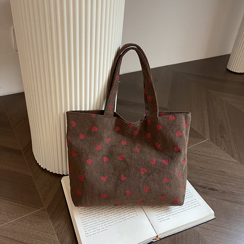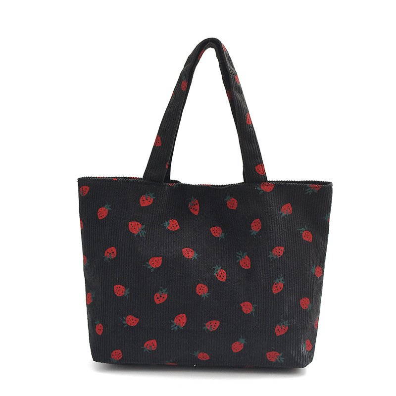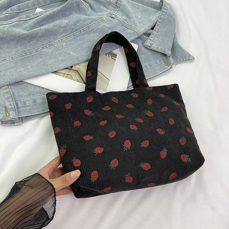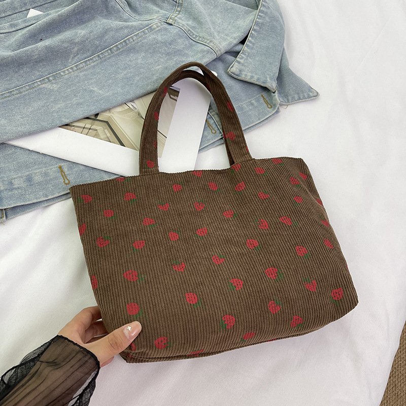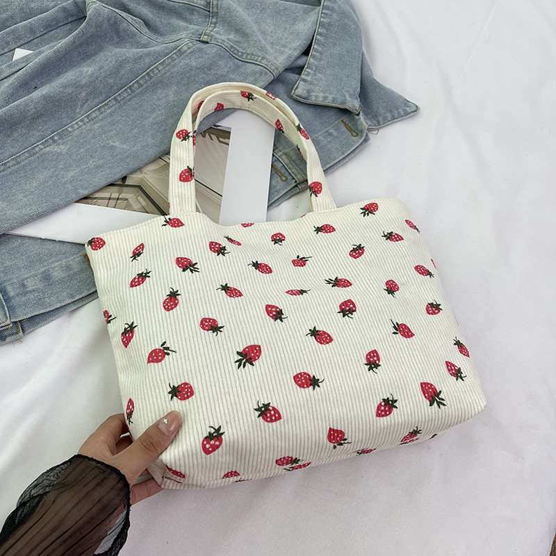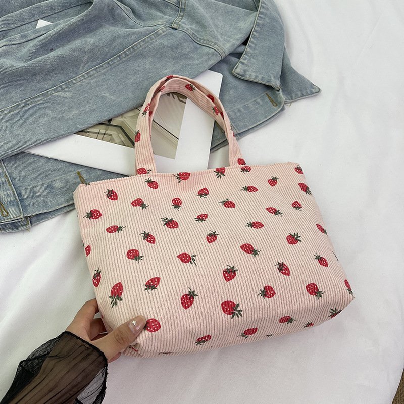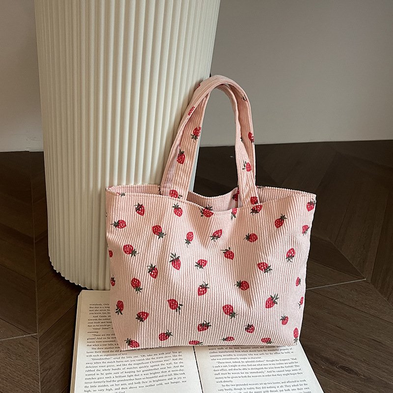 Strawberry print corduroy shoulder bag small fresh literary tote bag girl travel shoulder bag